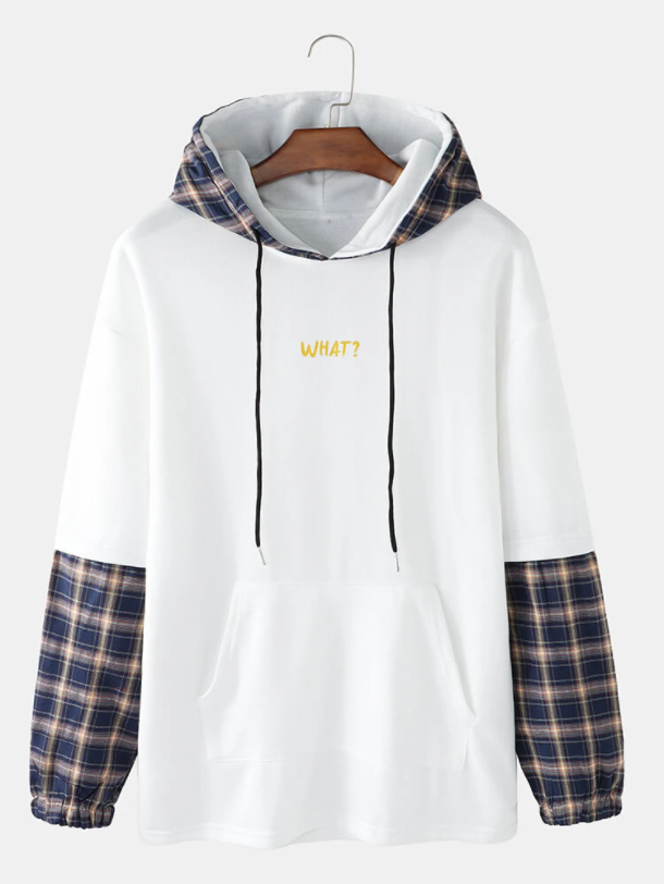 Mens Plaid Patchwork Letter Print Doctor Sleeves Casual Loose Hoodies With Muff Pocket