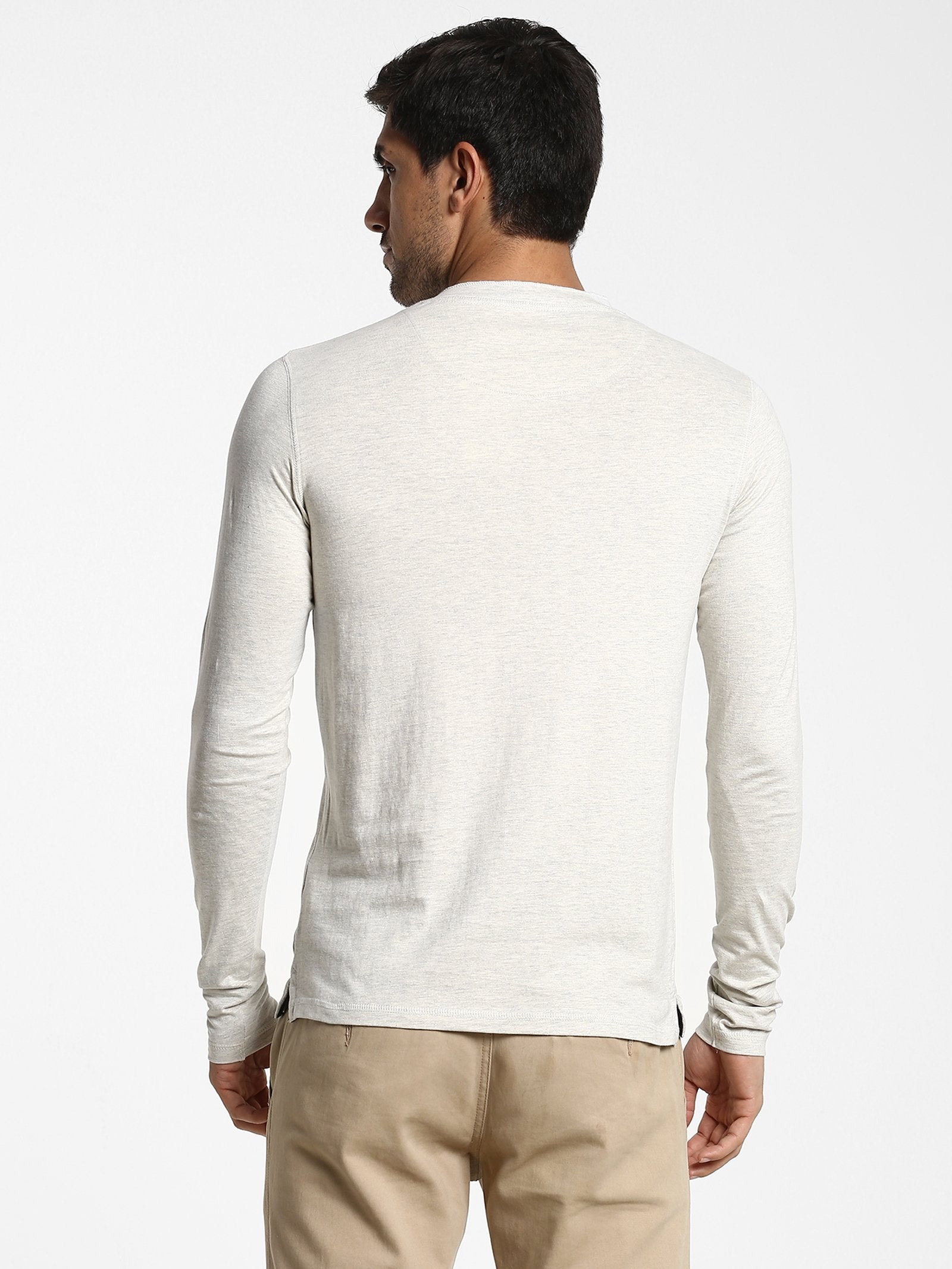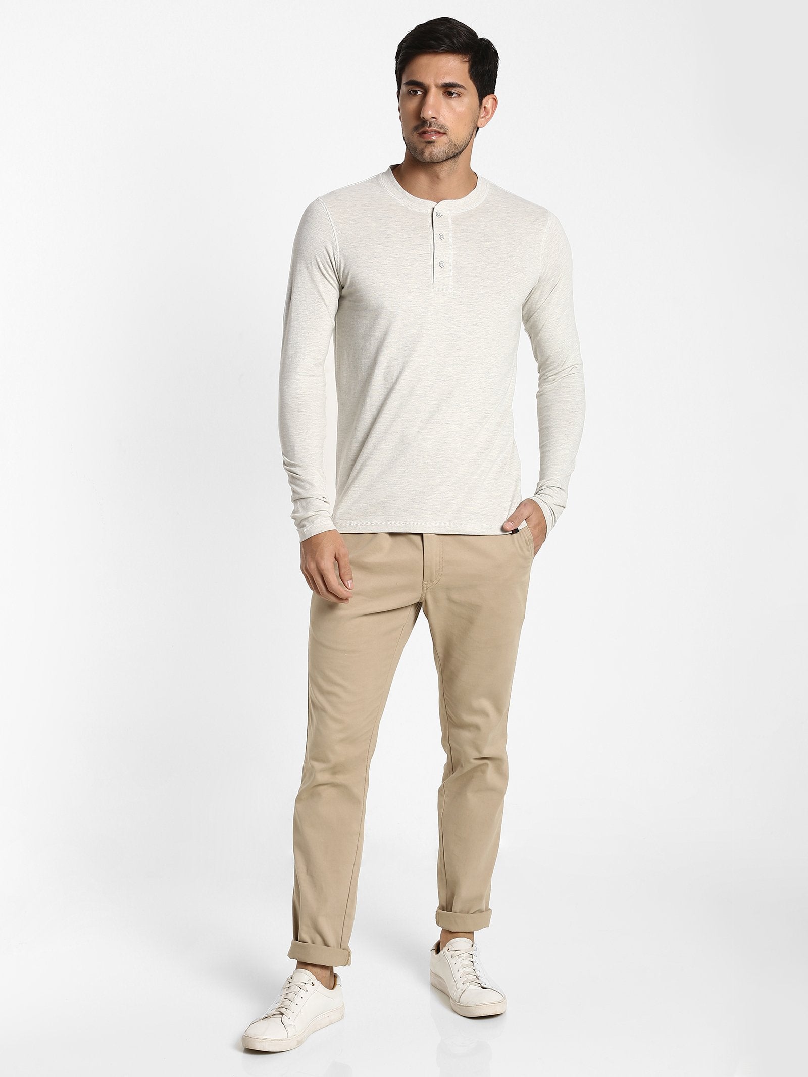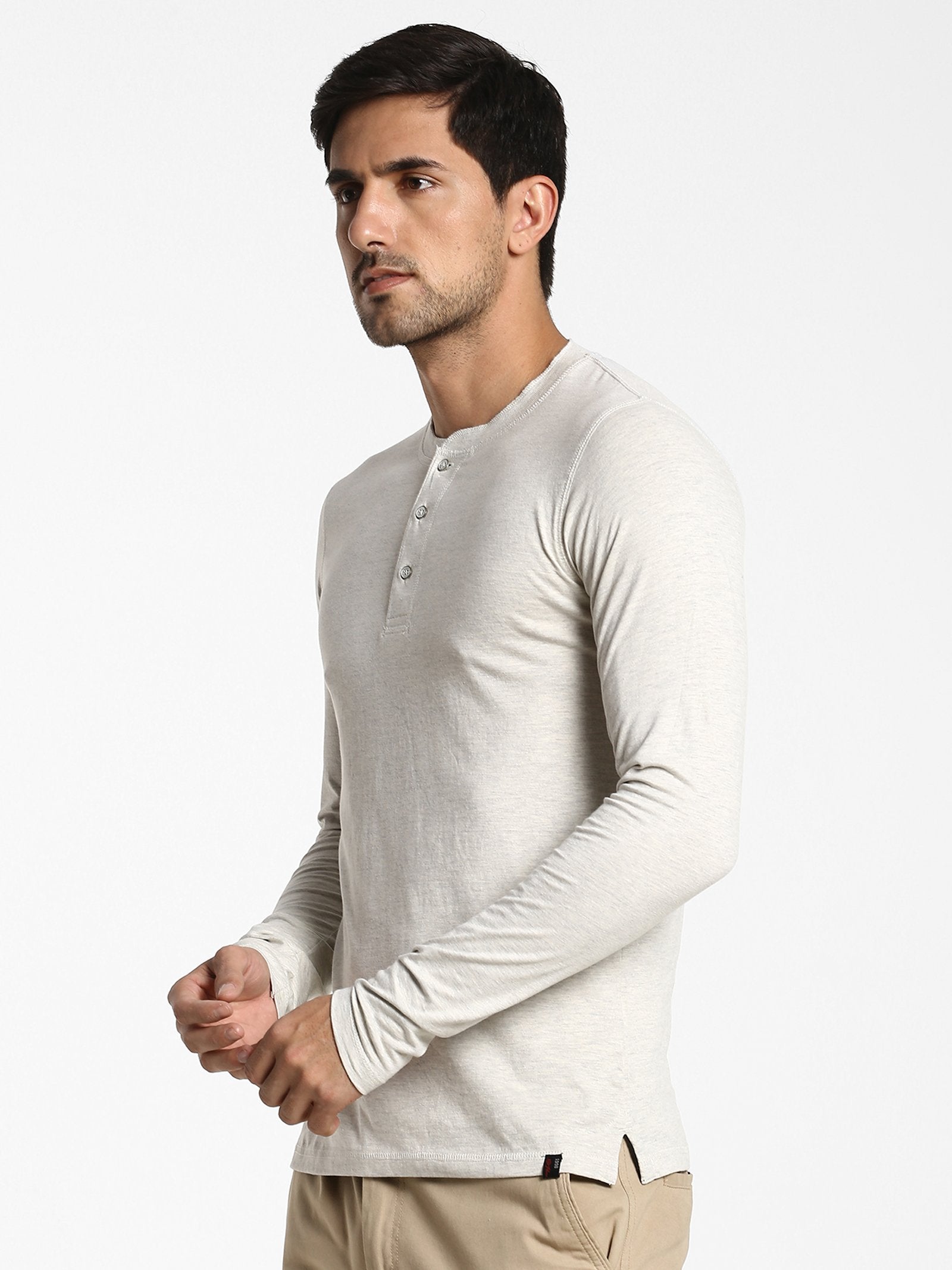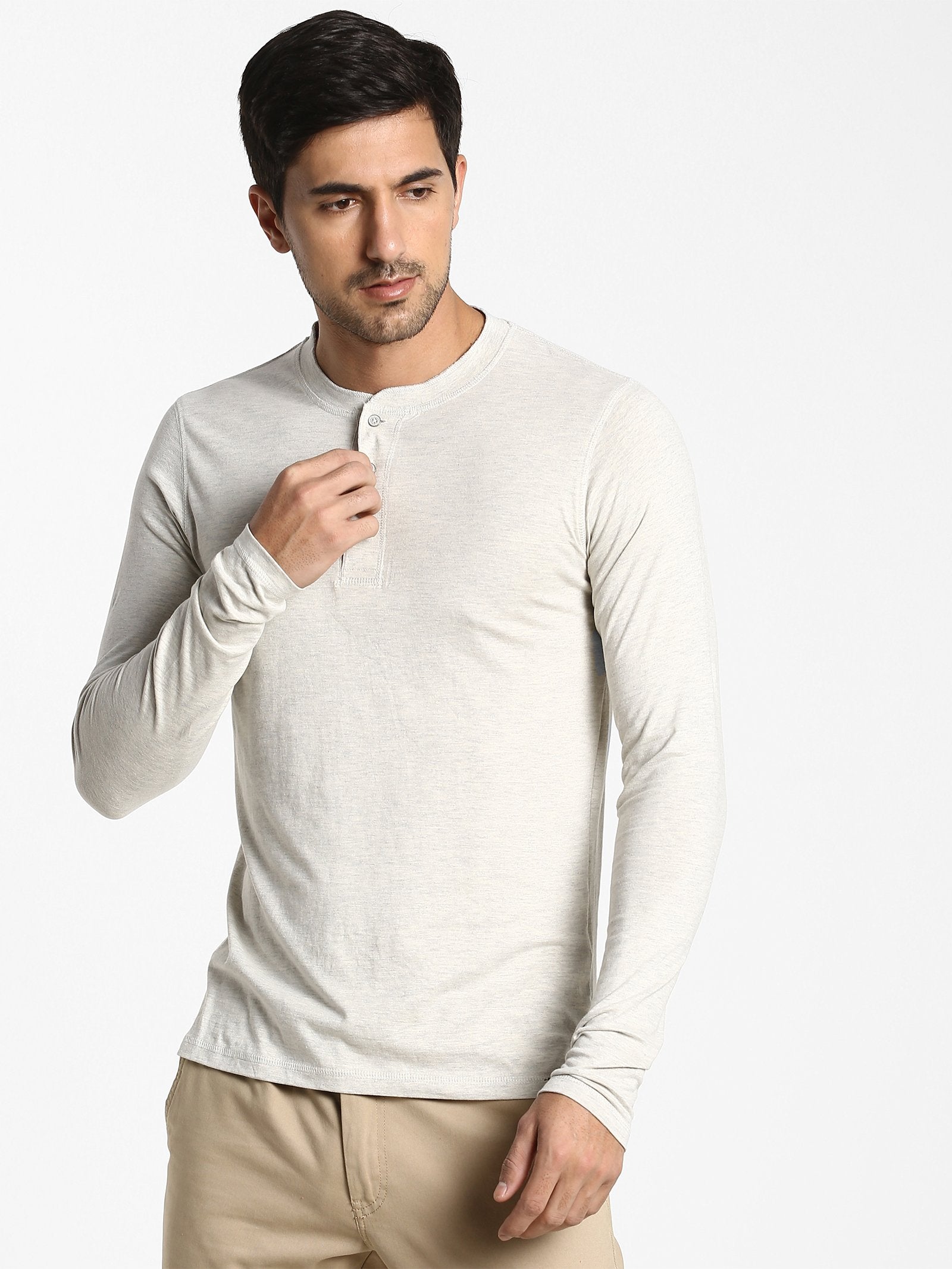 Color: Cream Fabric: Cotton Blend Pattern: Plain Sleeve: Long Sleeve Collar/Neck: Henley Neck Fit: Regular Fit Occasion: Basic Hemline: Straight Closure: Button Wash Care: Machine wash according to instructions on care...